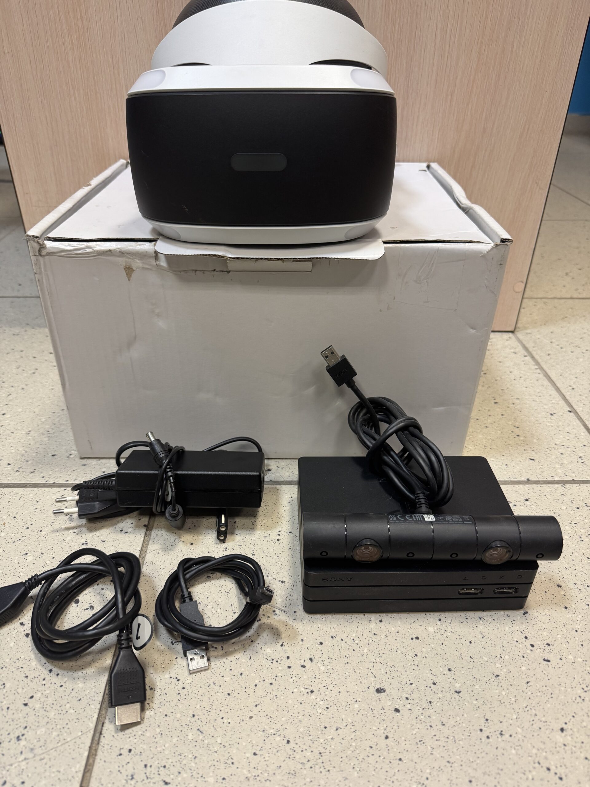 Komplekte: Akiniai, kamera, procesoriaus blokelis, maitinimo blokelis. micro-USB laidas, Hdmi laidas, dėžė.
